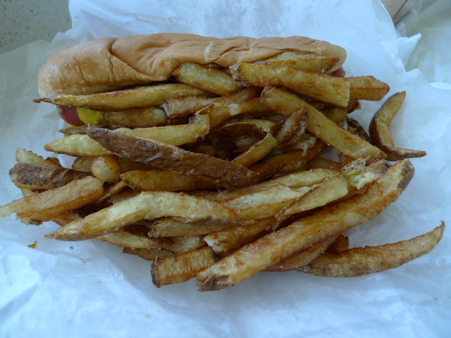 Well observed, Sherlock. I figured what we were not seeing was the Hot Dog itself; completely smothered in Fries. The missing ketchup was much less obvious. Plus, the ketchup angle never occurred to me because I never would have expected to see ketchup in the first place, because WHAT KIND OF MONSTER (over the age of ten) PUTS KETCHUP ON A HOT DOG???
